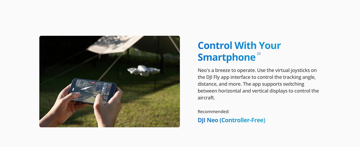 | Included Components | Screwdriver x1, DJI Neo Propeller Guard (Pair) x1, Type-C to Type-C PD Cable x1, DJI Neo Spare Propellers (Pair) x1, DJI Neo Aircraft x1, DJI Neo Intelligent Flight Battery x1, DJI Neo Spare Propeller Screw x4, DJI Neo Gimbal Protector x1 |