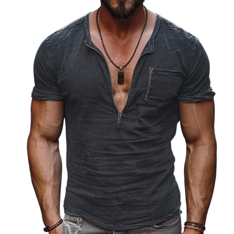 Product Name: Men's Casual Cotton Washed Zippered Neck Patch Pocket Short Sleeve T-Shirt