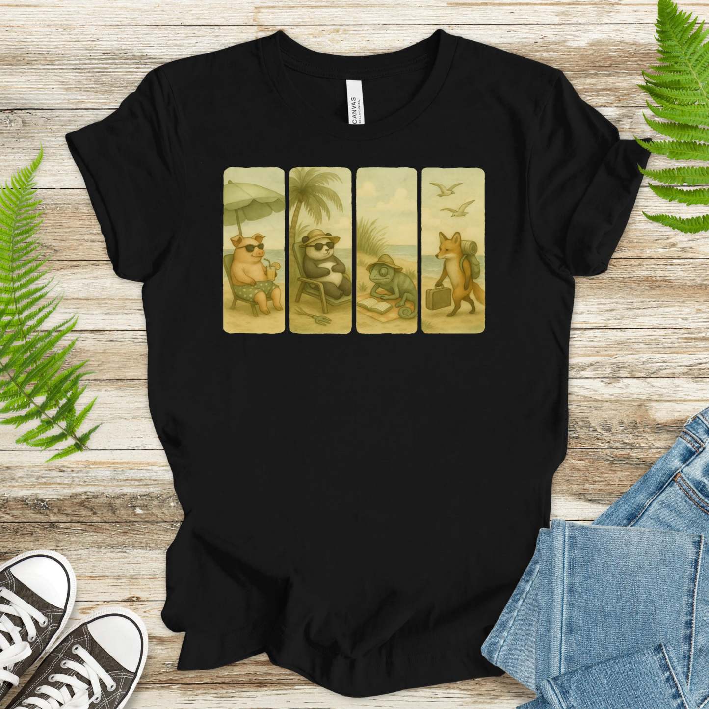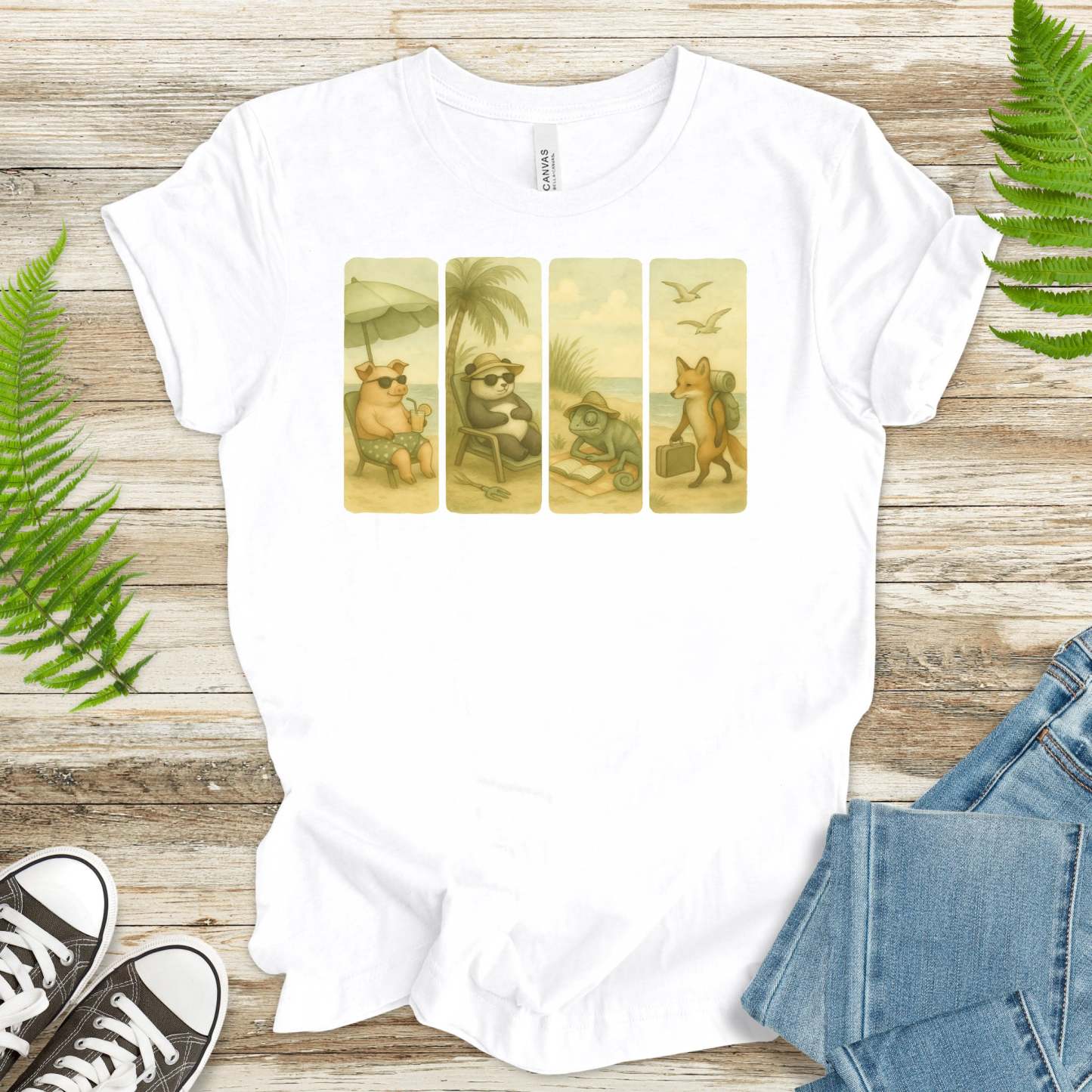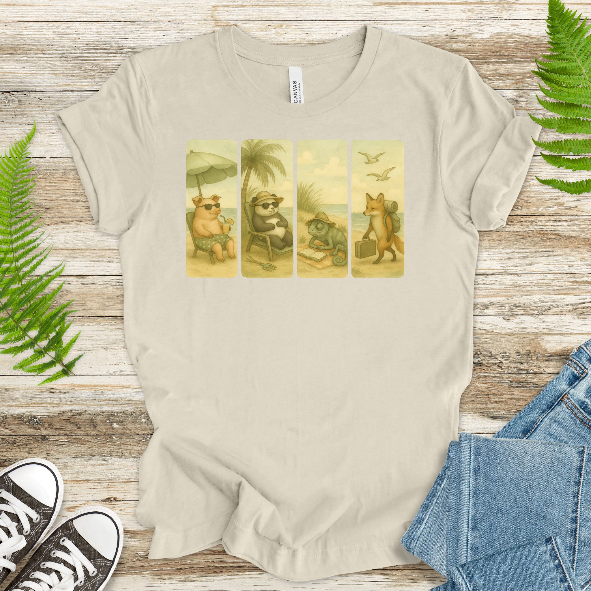 Beach Animal Strips T-Shirt – Cute Panda, Fox, Pig & Chameleon Vacation Tee