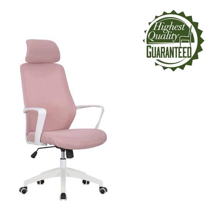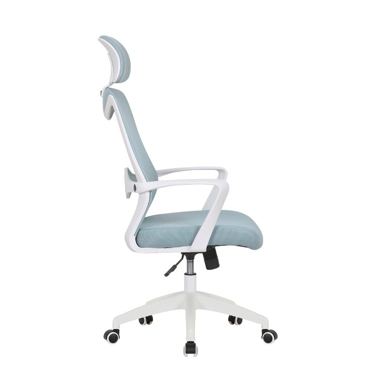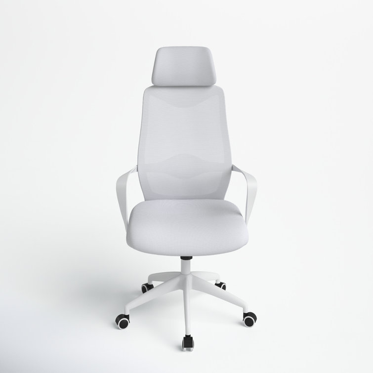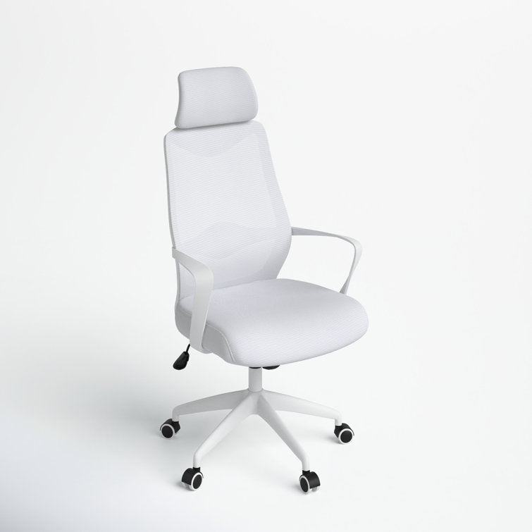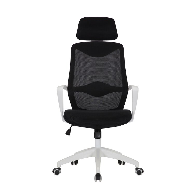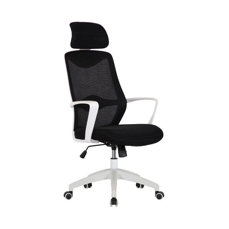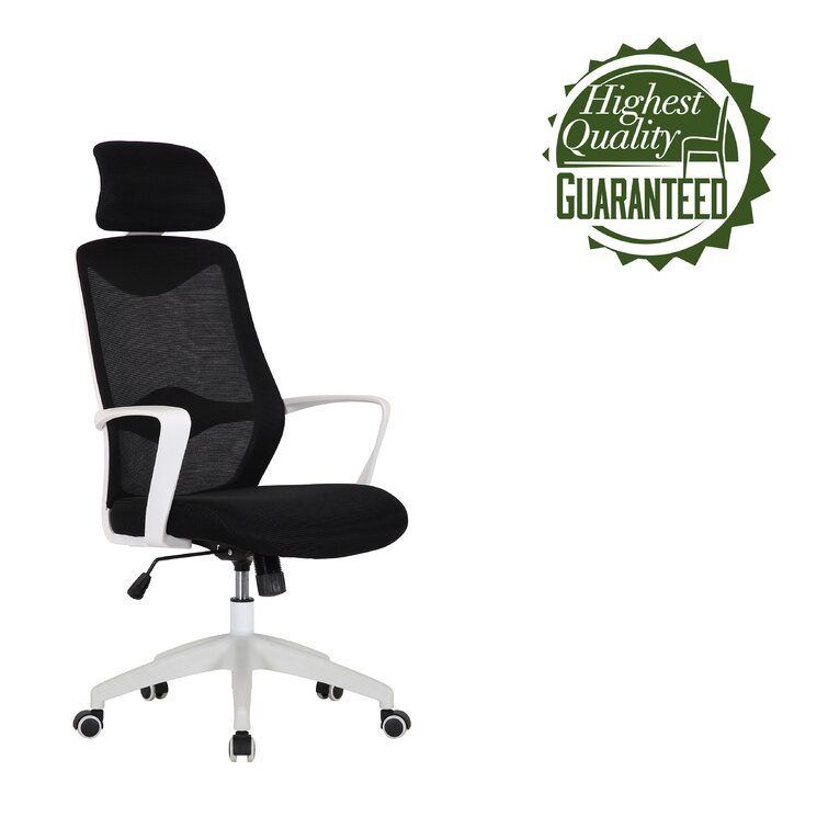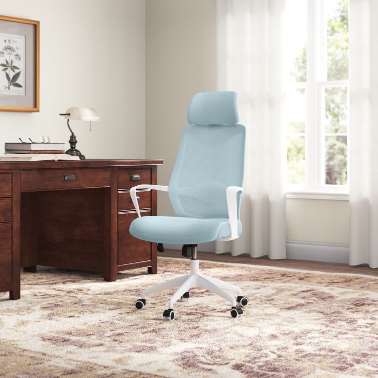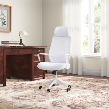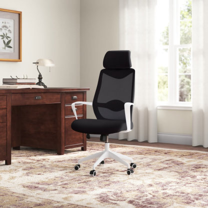 This swivel task chair features mesh fabric that allows air to circulate all day long, keeping you cool while you complete your to-do list. Its sleek frame rests on caster wheels that make mobility a breeze, while fixed, curved arms offer a place to rest your elbows. This chair features an S-shaped back for proper lumbar support for up to eight hours. Seat-height adjustment and a center-tilt mechanism that locks in place let you adjust and move back when you want to stretch out. Plus, this chair has a padded headrest for lots of support while you work in your home office. All the assembly tools you need are included.